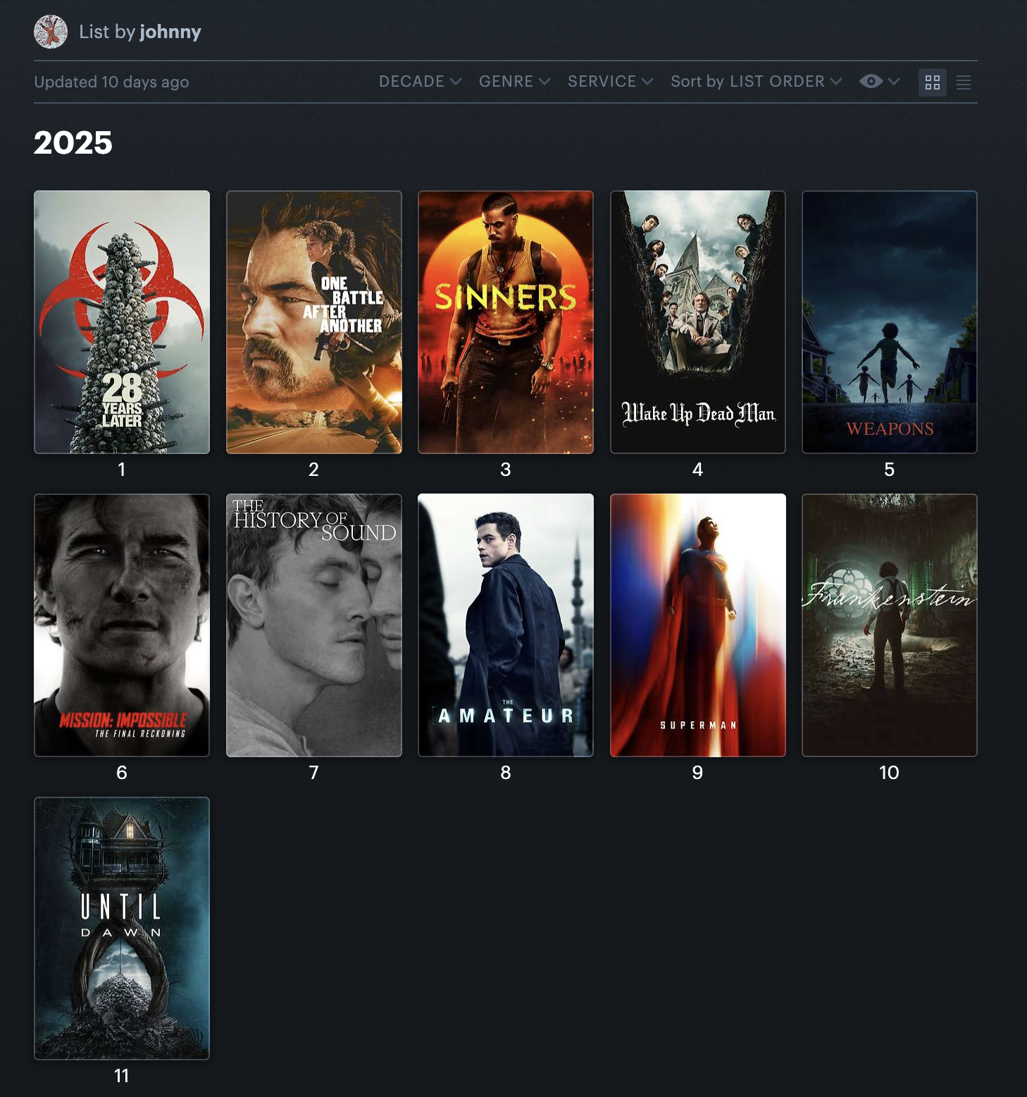 I have not seen many movies I liked this year. My ranking for the year has 3 movies I loved, 1 I liked, and 7 I either disliked or hated. I think I will catch up on a bunch of them in the next few months, as I know there have been some great ones that I missed, but it’s been a rough year. The disappointments of Mission: Impossible - The Final Reckoning and Superman have been hard to wash from my mouth, as have expected letdowns like Frankenstein and Weapons. Wake Up Dead Man was a pleasant surprise, but the real star this year was Sinners. It’s so fucking cool to love a movie with everyone and see it resonate deeply with so many people. I heard discussions about Sinners in the comic shop! My favorite history professor played a clip to introduce her class! I rewatched it with my best friends and we all loved it! One Battle After Another was almost a similar vibe to Sinners in the triumphalist community around it, though it’s much more limited to cinephiles. I also have a host of issues with how that movie portrays Black women and revolution, but it is a JAWS level work of tense and fun filmmaking. 28 Years Later is my current number one on the year for its unflinching look at mass death and the necessary mourning, juxtaposed against the same noxious brand of nostalgia that is in our governments eating away at reality.