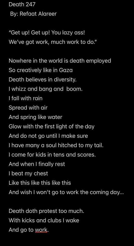 Here is a poem by Refaat Alareer, a poet, professor, thinker, and human who was assassinated on December 6th, 2023, along with his brother and his nephew, by an israeli missile. He posted this poem on October 14th, 2023. Refaat continued to write and post poetry during the genocidal campaign following October 7th, and his poem, “Death 247 in Gaza”, is full of the love and radicalism that he embodied.